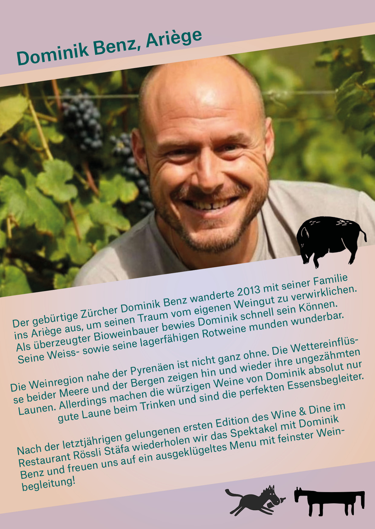 Der gebürtige Zürcher Dominik Benz wanderte 2013 mit seiner Familie ins Ariège aus, um seinen Traum vom eigenen Weingut zu verwirklichen. Als überzeugter Bioweinbauer bewies Dominik schnell sein Können. Seine Weiss- sowie seine lagerfähigen Rotweine munden wunderbar.